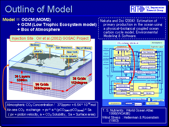 Research on the Mitigation Effect on Surface Ocean Acidification by CO2 Ocean Sequestration ![]() Outline of global numerical simulation model Global numerical simulation model is constituted by physical model and ecosystem model. The physical model used in this study is Version 2 of the GFDL Modular Ocean Model (MOM2; Pacanowski, 1996). The ecosystem model is lower-trophic marine ecosystem model (Nakata and Doi, 2004). The result of the