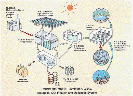 This project is aimed to develop technologies to fix CO2 in the flue gas from the generation sources such as power plants and factories, with more of ten times higher efficiency than natural vegetation does, and to produce the useful substances from the fixed CO2.