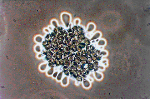 Botryococcus that is well-known to produce a hydrocarbon was selected and isolated, and was studied on its capability of CO2 fixation rate and productivity of the hydrocarbon. The picture is showing that the colony of Botryococcus is pressed and the drop of hydrocarbon is formed around the colony. It seems that Botryococcus contain high percentage of hydrocarbon. Comparing with heavy oil class C, the extracted oil from this Botryococcus braunii SI-30 shows almost same calorie with very few N and S contents. Therefore, the extracted oil could be called as "environmental friendly oil".