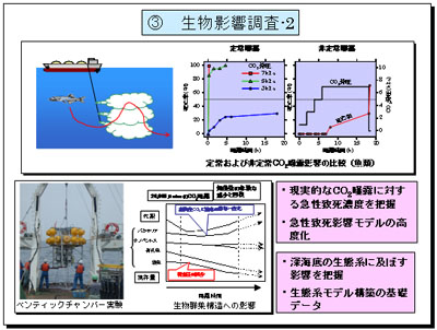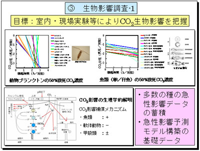 さらに、生物影響調査では海洋隔離による「現実的なCO2曝露に対する急性致死濃度を把握」しています。