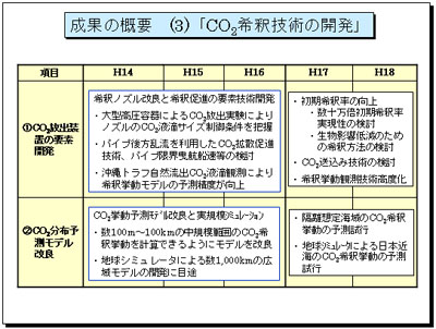 「沖縄トラフ自然流出CO2液滴観測により希釈挙動モデルの予測精度の向上」を図ってきました。最終年度までには、「初期希釈率の向上」を目指して、「数十万倍初期希釈率実現性の検討」、「生物影響低減のための希釈方法の検討」を行うとともに、「