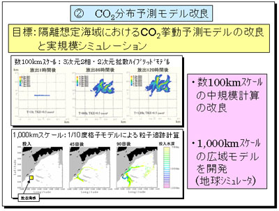 「CO2分布予測モデル改良」は、「隔離想定海域におけるCO2挙動予測モデルの改良と実規模シミュレーション」を目標として実施しています。「数100kmスケール」のモデルでは、「3次元2相モデルと2次元拡散モデルのハイブリッドモデル」を改良をして、このように、20km四方の海域を対象とするCO2希釈挙動の計算が可能となっています。