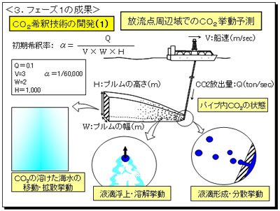 Shipから下ろしたパイプの先端でノズルから放出される液体CO2がどのような大きさの液滴になって出てくるか、その液滴がどのように浮上してゆきながら海水へ溶解してゆくか、溶解したCO2がどのように移動・拡散するかといった研究をおこないました。