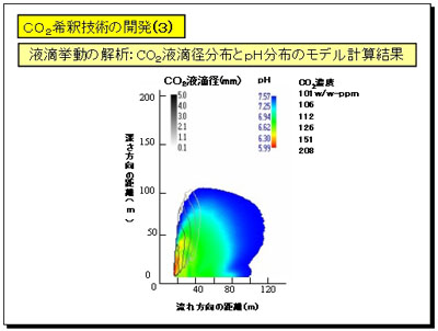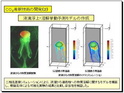 CO2が浮上してゆくとともに、CO2の溶けた海水が下の方へ降りてゆく状況をモデル化することができております。別途、高圧水槽中で液滴が海水へ溶解する過程の観察にも成功しており、同様の結果を得ています。これによって溶解希釈型の海洋隔離技術の原理を基礎的に確認できました。