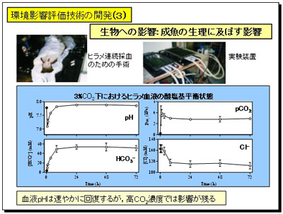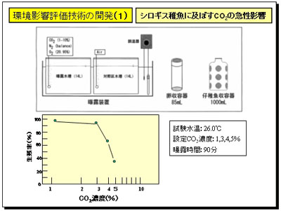 海洋隔離で予想されるCO2濃度は、カーテン状の初期放出域で約1%以下であることから、この実験によればCO2による急性影響はほとんどないと推定されます。