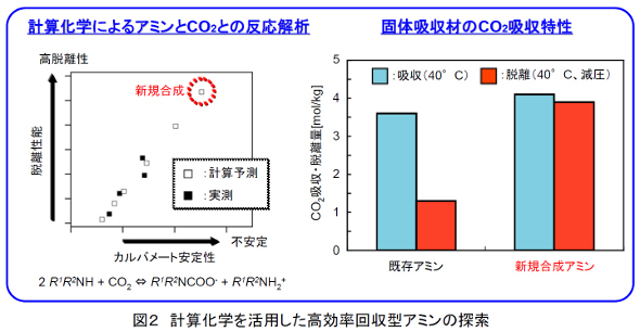 これまでに、アミンの分子構造とCO2脱離性能との関係性を計算により明らかにしたことで、脱離性能に優れ、高いCO2回収容量を有するRITE独自の固体吸収材を開発することに成功しました(図2)。