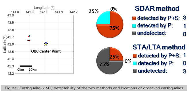 In order to utilize seismic monitoring data in ATLS, it is essential to detect all microseismicity (ultramicro earthquakes) and not to identify noise as an event in error. To identify microseismicity in observation data without errors, we have adopted not the conventionally-used Short Term Average/Long Term Average method (STA/LTA), but a new approach called the Sequentially Discounting AR model learning (SDAR). In this year, we have examined the applicability of the two methods, using observation data obtained by the Ocean Bottom Cable (OBC) in the Tomakomai CCS demonstration project. Figure shows results of an analysis for earthquakes of which magnitude is less than M1 occurred within 100 km of OBC in a year. The results indicate that SDAR with parameters turned appropriately is capable of detecting seismic events more surely than STA/LTA. We plan to investigate its applicability to the analysis of other observation data acquired, for example, with borehole seismometers.
