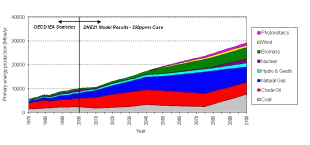 The increase of the share of natural gas supply in the total primary energy is cost-effective in the 550 ppmv Stabilization Case. The increases of photovoltaics, wind power, nuclear power and biomass energy uses are also cost-effective after the middle of the 21st century. Coal also increases in 2100 because of the use of Integrated coal Gasification Combined Cycle (IGCC) with CO2 capture.